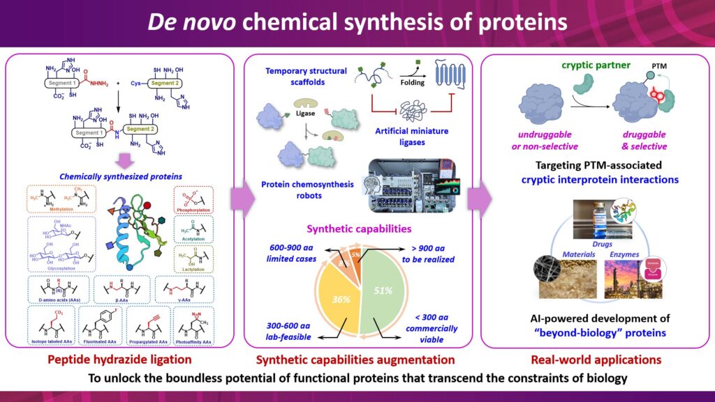 We are developing a comprehensive de novo chemical protein synthesis methodology to create structurally unrestricted proteins capable of transcending the constraints of biology. This methodology is centered on the widely adopted peptide hydrazide ligation we pioneered—an approach enabling flexible, high-yield, and cost-effective assembly of multiple peptide segments into full-length proteins via a convergent strategy. Three technical innovations steadily augment this hydrazide-centric methodology: 1) temporary structural scaffolds to expedite protein folding; 2) artificial miniature ligases to accelerate interdomain assembly; 3) protein chemosynthesis robots to enable AI-driven automation. Leveraging this methodology, we design and generate an expanding repertoire of synthetic—and often “beyond-biology”—proteins across unbounded chemical space: either to discover and target cryptic, therapeutically rewirable interprotein interactions (e.g., via molecular glues) for disease intervention, or to develop artificial protein products (protein/peptide drugs, enzymes, and biomaterials) through AI-powered generative molecular design.